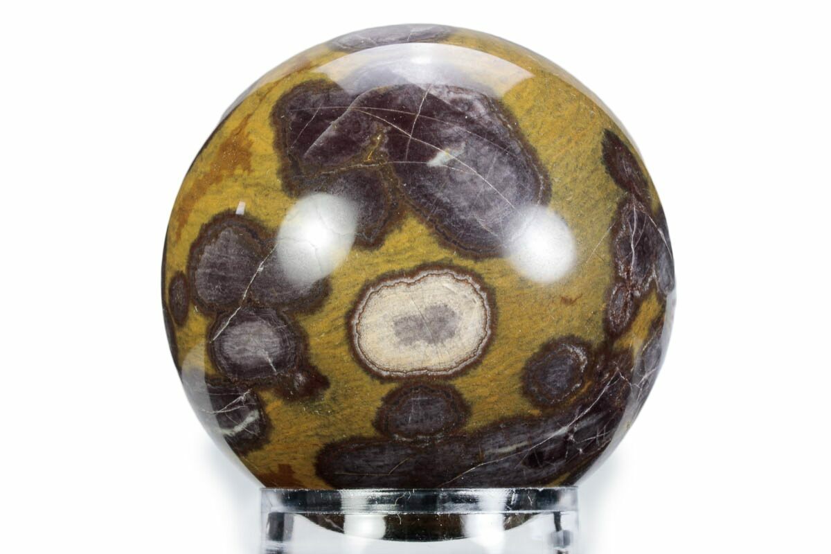 This is a colorful, 2.8" wide Morgan Hill poppy jasper sphere. This colorful material was collected from the foothills of the Santa Cruz Mountains in Morgan Hill, California. It has been flawlessly polished to a glossy finish with no dull spots or scuffs.