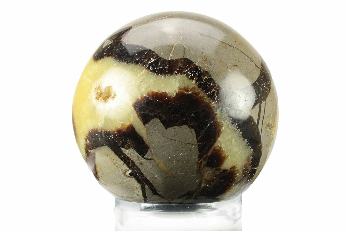 This is a beautiful, polished sphere of septarian. The septarian comes from the Betsiboka Region of Madagascar and was deposited during the Jurassic period. The polishing reveals a beautiful pattern, often causing these spheres to be called dragon spheres as they remind people of what they imagine dragon skin looking like.