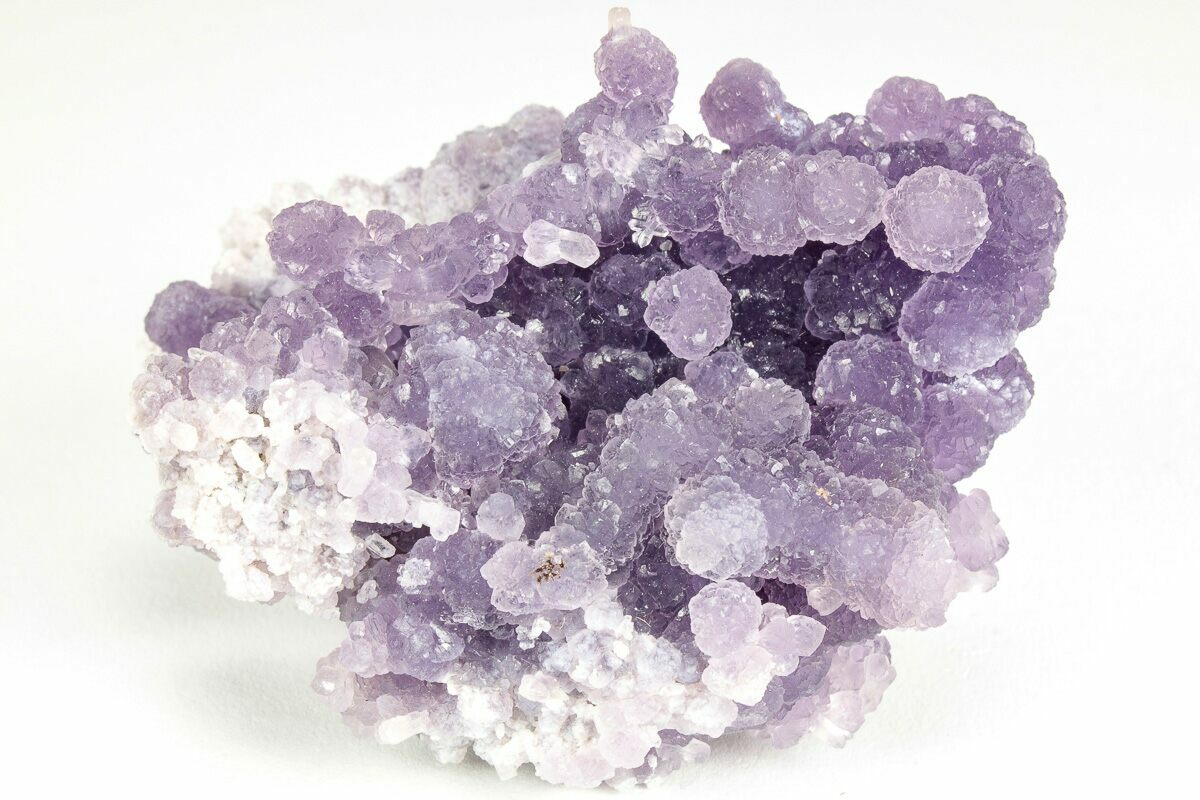 These formations were created over millions of years as silica-rich fluids filled voids and crevices in volcanic rock. As the fluids cooled, they precipitated tiny quartz crystals, which slowly grew in layers to create the nodules we see today. Its mineral composition and appearance set it apart from traditional agates, and it would be most technically correct to call it a "amethystine botryoidal chalcedony". As a collectible mineral, it’s relatively durable but should be kept out of direct sunlight to prevent color fading.