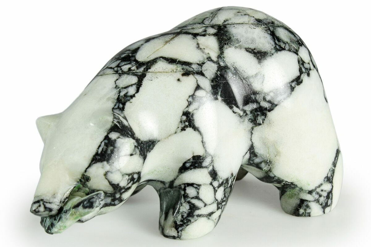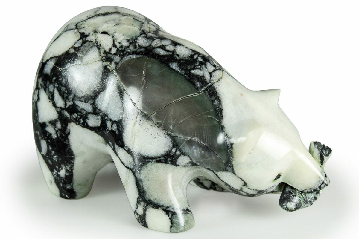 This is a beautiful, 2.8" long polished bear sculpted from black and white marble, collected in Alaska. The stone has been meticulously shaped and polished to create this unique piece. A small fish of the same material can be seen in its mouth, as though it were just freshly snatched up from a stream.