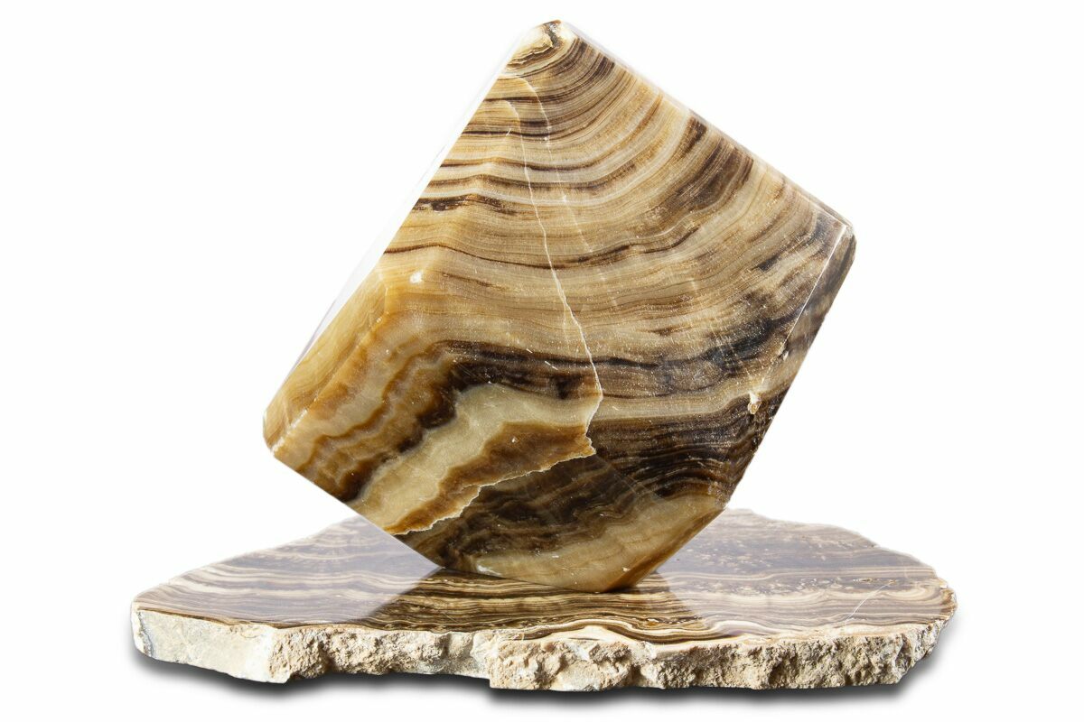 This is a 2.8" wide, polished chocolate calcite cube. One corner is cut so that it displays free standing on a hard surface. It comes a separate, polished calcite slab that acts as a wonderful display base.