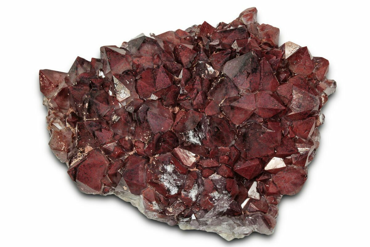 Thunder Bay amethyst is known for its impressive color range, spanning from soft, lavender hues to deep, nearly black tones referred to as “black amethyst.” What sets this locality apart, however, is its distinctive red hematite inclusions. These appear as microscopic disks, spherules, or dust-like clouds suspended within the quartz, creating brilliant flashes of red and orange when the crystals catch the light. In some specimens, the hematite is so pervasive that whole sections—and occasionally entire crystals—take on a warm reddish glow. This combination of rich purple quartz and iron-derived coloration gives Thunder Bay amethyst its unmistakable and highly sought-after appearance.