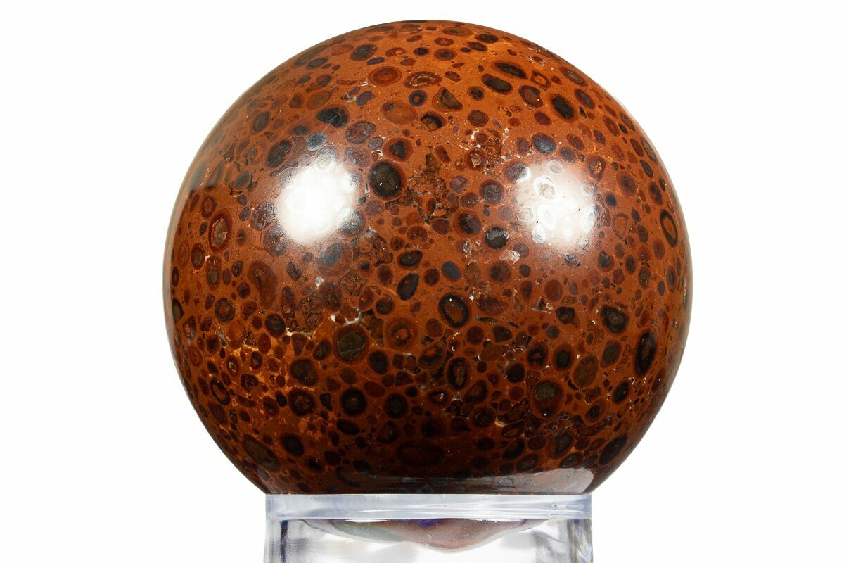 This is an incredible polished sphere made of bauxite (aluminum ore) mined in Russia. It is old collection material that was provided in its rough form and later polished to a glossy-finish. The polish brings out the spherical, red-brown ore bodies which contrast beautifully against the red-orange matrix. Seldom is this beautiful material found on the market.