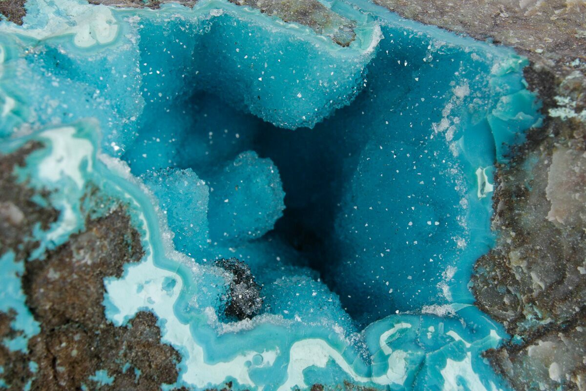 This vibrant specimen features a rock cavity filled with chrysocolla that's completely encrusted in a layer of druzy quartz. The sparkling quartz crystals are translucent, allowing for the underlying light blue chrysocolla to be seen. This material was collected from the Tenke-Fungurume area of Lualaba, Democratic Republic of the Congo.