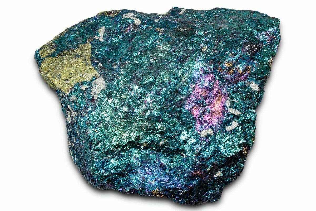 Often called “Peacock Ore” for its vivid, iridescent colors, this material is actually chalcopyrite that has been treated with acid. The treatment replicates a natural process that forms the much rarer copper mineral bornite.