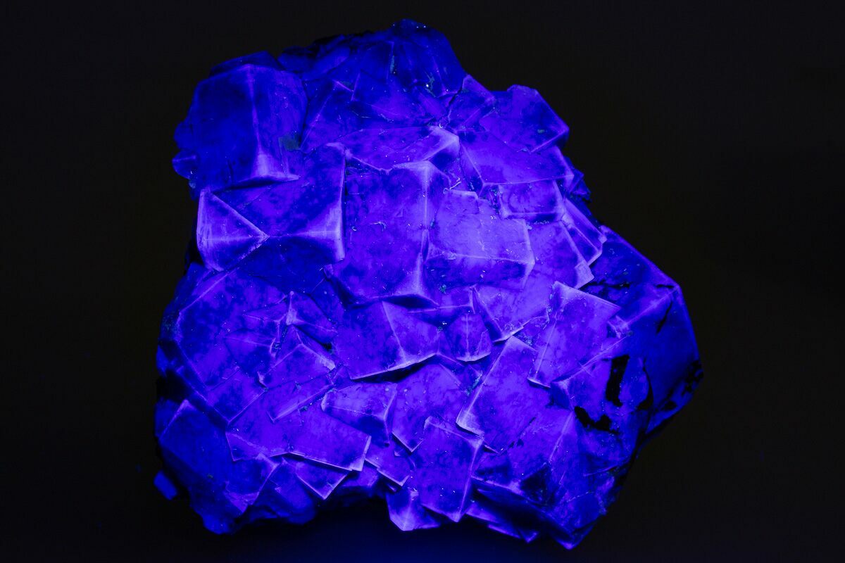 This is a superb, 2.9" wide cluster of lustrous cubic fluorite crystals collected from the famous Okorusu Mine in the Otjozondjupa region of Namibia. The crystals are a deep blue-green color with phantoms that can be seen when shining a light into the crystals. Under short-wave UV, the specimen exhibits a vibrant purple fluorescence.