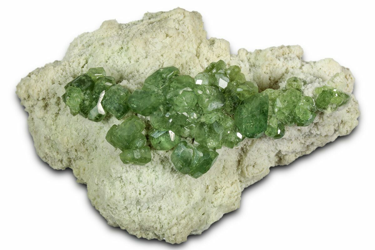 This is a beautiful cluster of gemmy green andradite var. demantoid garnets on matrix. It was collected from the Antetezambato Demantoid-Topazolite Mine in Diana, Madagascar. The garnets have gorgeous apple-green coloration that contrasts nicely against the white matrix.