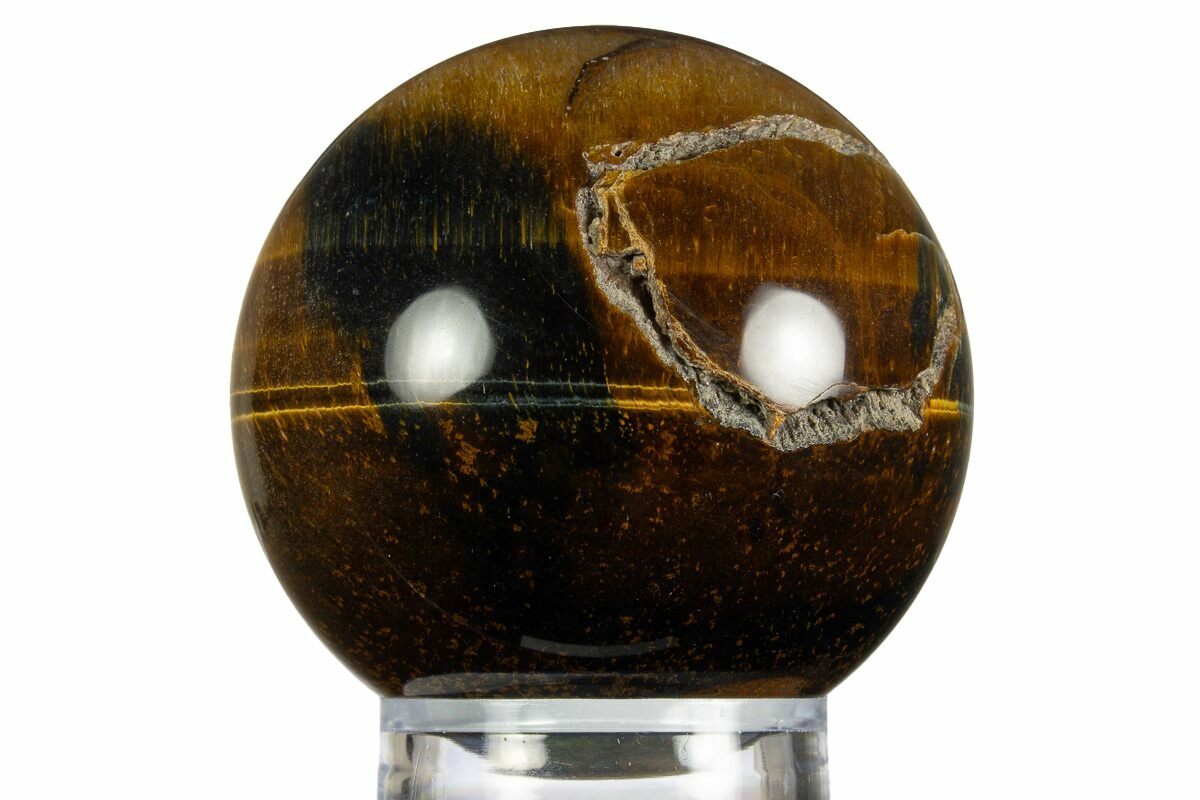 This is a top quality, 2.9" wide polished tiger's eye sphere. The flawless polish really brings out the blue and orange coloration, as well as the natural chatoyant effect when the sphere is rotated.
