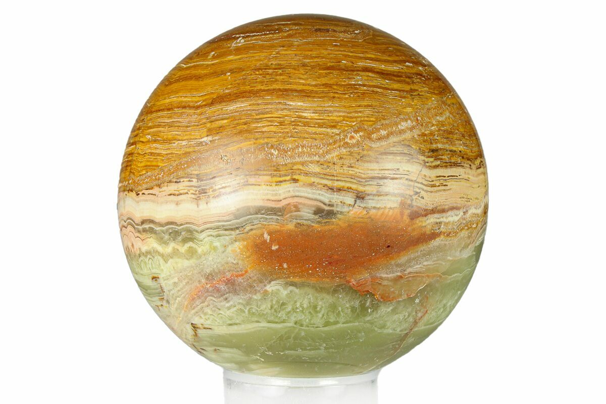 This is a beautiful polished sphere carved from a kind of calcite often (incorrectly) marketed as Pakistan green onyx. The stone shows lovely olive greens with white, brown, and pink banding. It measures 2.9" in diameter and comes with an acrylic display stand.