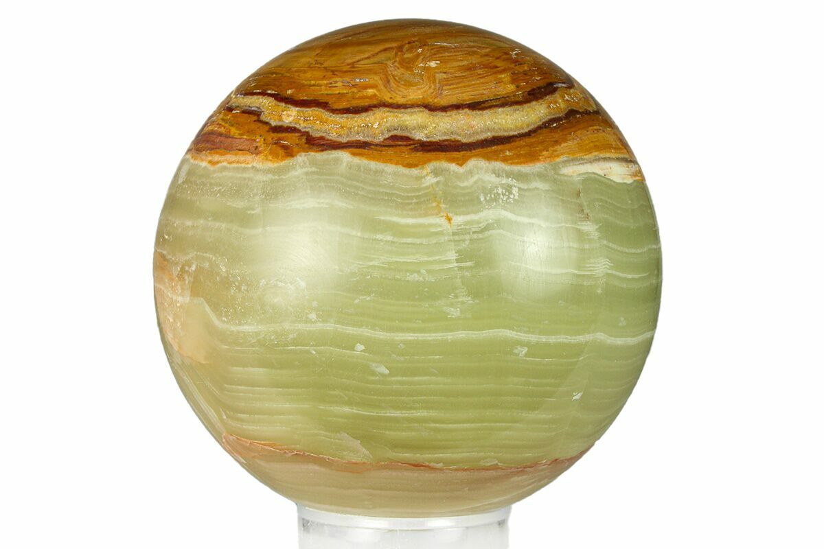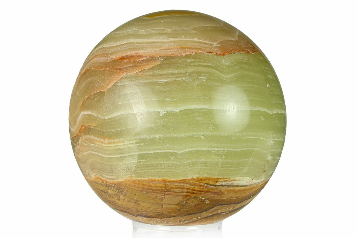 This is a beautiful polished sphere carved from a kind of calcite often (incorrectly) marketed as Pakistan green onyx. The stone shows lovely olive greens with white, brown, and pink banding. It measures 2.9" in diameter and comes with an acrylic display stand.
