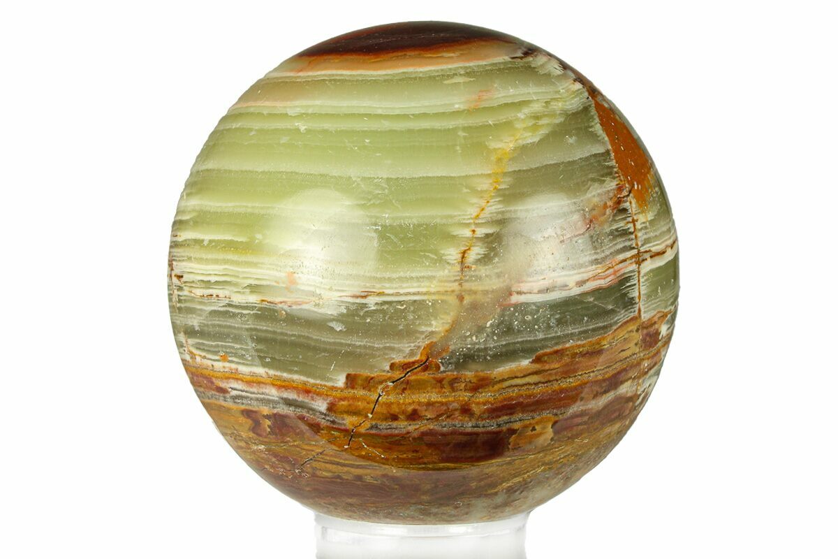 This is a beautiful polished sphere carved from a kind of calcite often (incorrectly) marketed as Pakistan green onyx. The stone shows lovely olive greens with white, brown, and pink banding. It measures 2.9" in diameter and comes with an acrylic display stand.