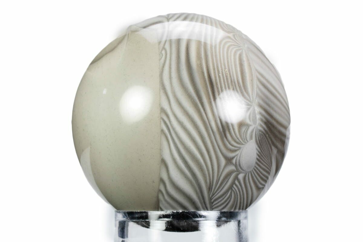 This is a 2.9" wide polished sphere made from striped flint collected in the Swietokrzyskie Mountains of Poland. This form of flint is fairly rare and typically displays a striking banded striping pattern, hence its use today in jewelry. The cream, brown, and mahogany colors appeal to the senses in their swirled patterns, and are reminiscent of latte art.