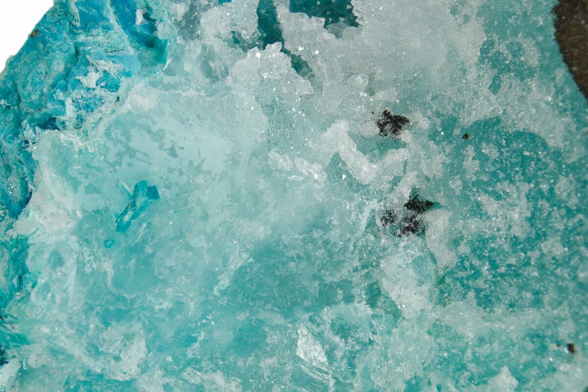 This specimen includes a rock matrix partially covered in chrysocolla. The chrysocolla is encrusted in a layer of druzy quartz. The sparkling quartz crystals are translucent, allowing for the underlying light blue chrysocolla to be seen. This material was collected from the Tenke-Fungurume area of Lualaba, Democratic Republic of the Congo.