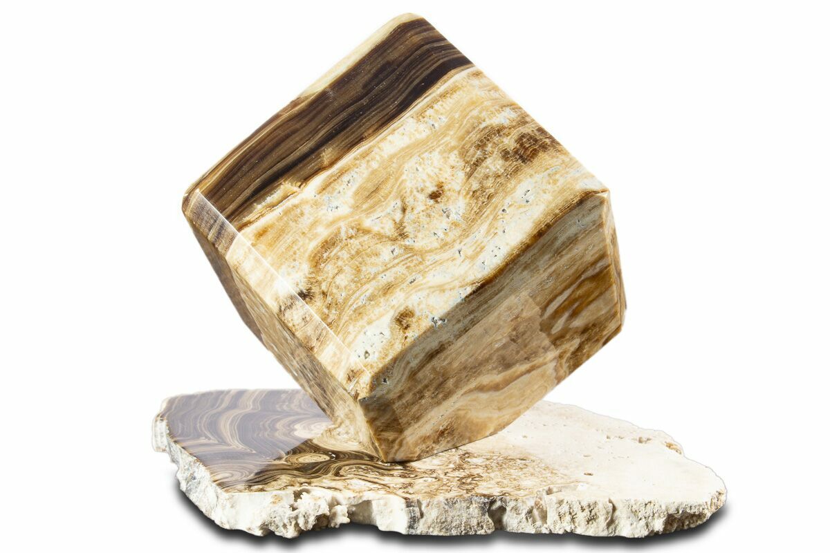 This is a 2.9" wide, polished chocolate calcite cube. One corner is cut so that it displays free standing on a hard surface. It comes a separate, polished calcite slab that acts as a wonderful display base.