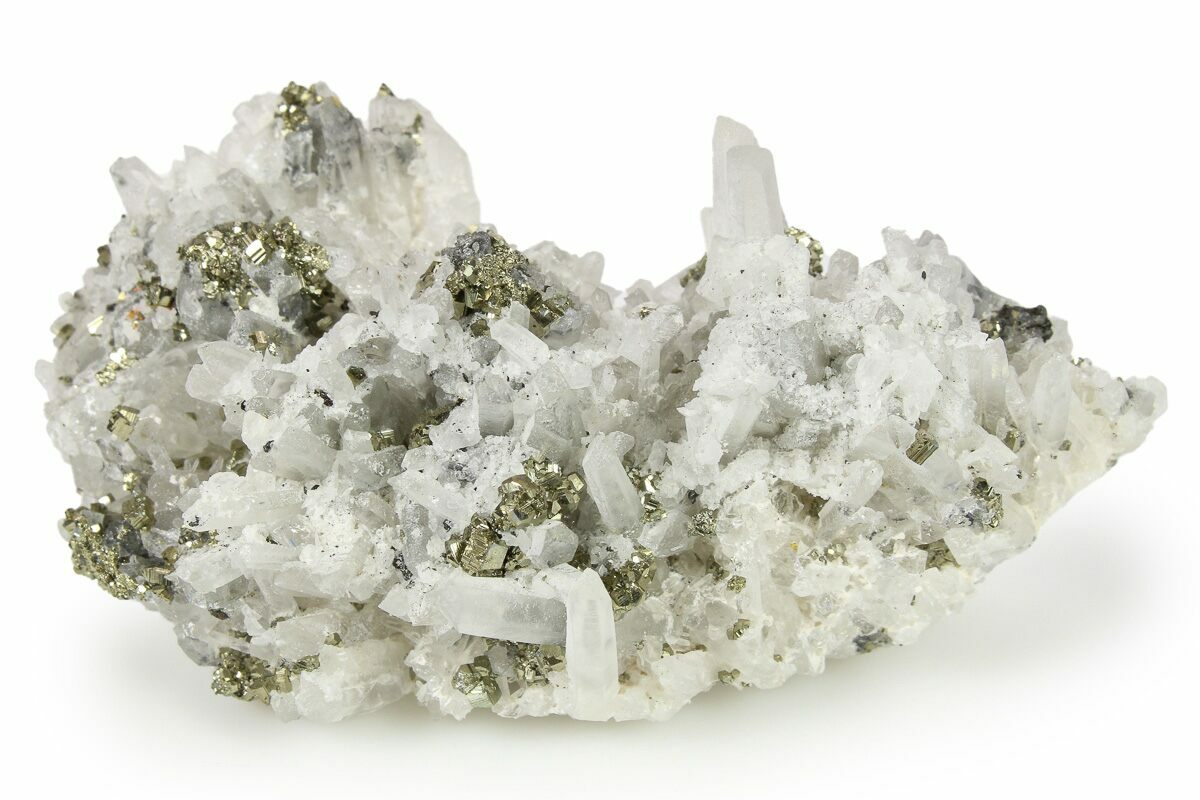 This is a gorgeous cluster of needle-like quartz crystals and glittery striated pyrite on matrix. It was collected from the Huanzala Mine in Peru. The entire specimen measures 2.95" wide.