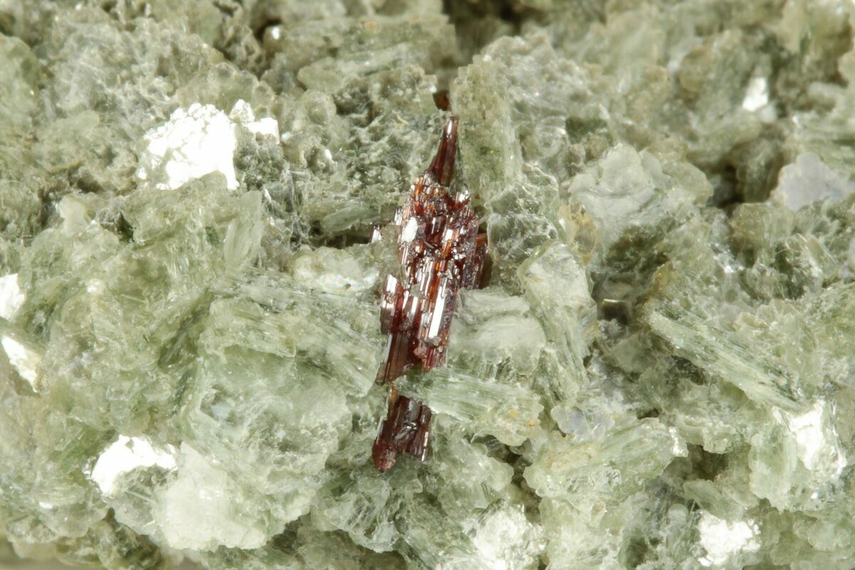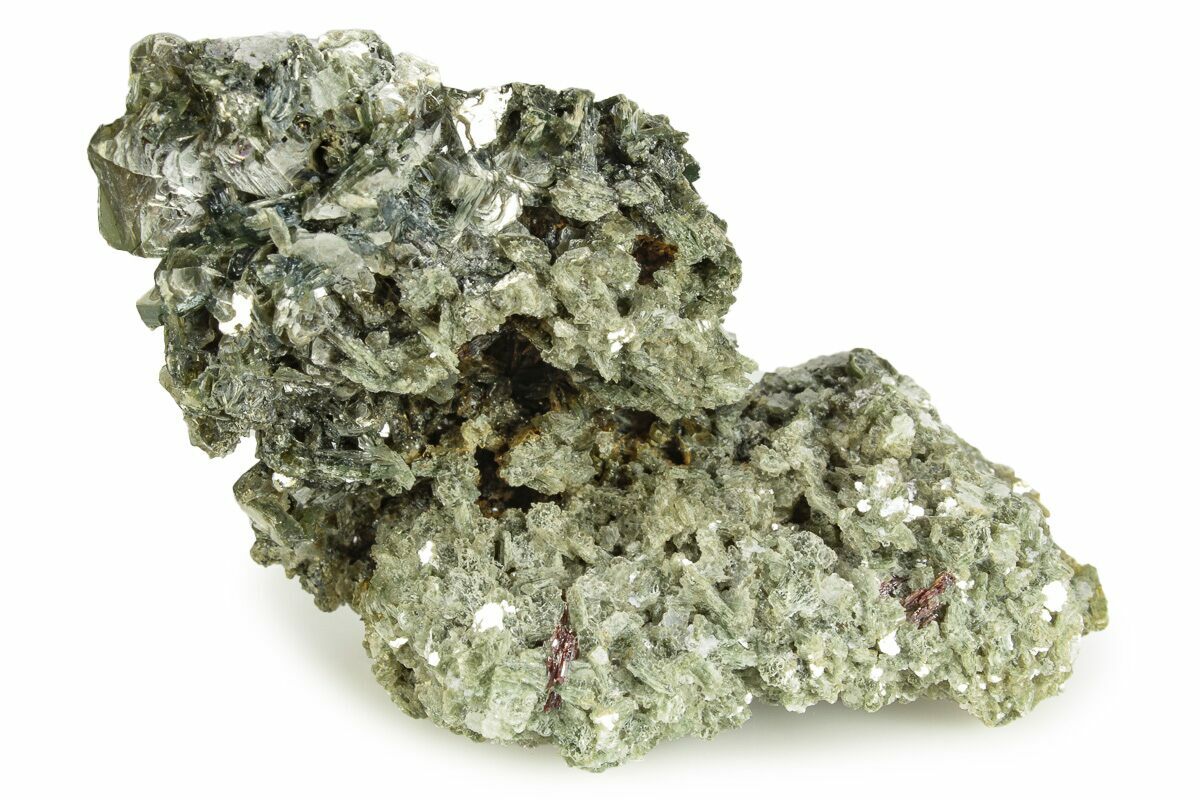 Here is a beautiful cluster of muscovite crystals, collected from Adams farm in Alexander County, North Carolina. The specimen measures 2.95" wide and the muscovite crystals exhibit an eye catching luster. Vibrant red rutile crystals can be found intertwined with the muscovite crystals