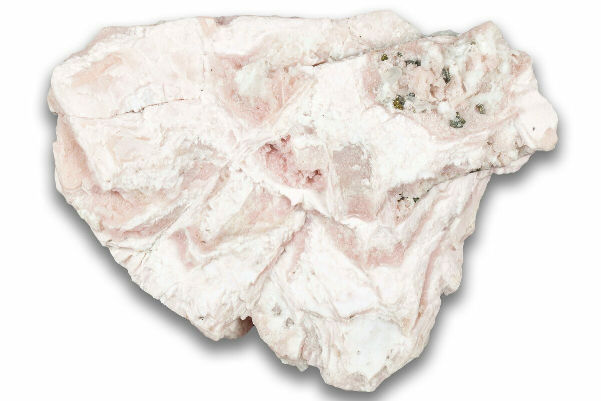 This is a formation of light pink rhodochrosite collected from Bulgaria. The rhodochrosite formed as/on sheets with a reticulated appearance, and small, brassy chalcopyrite crystals can be found on what could be considered the underside of the specimen.