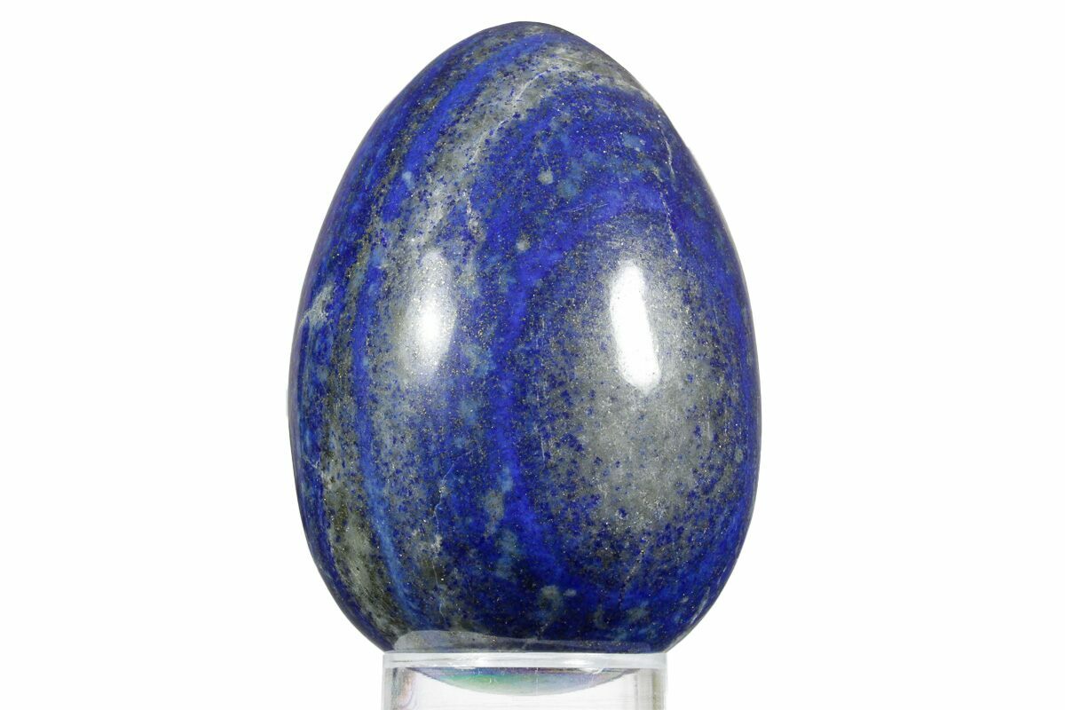 This is a 2.95" tall, polished lapis lazuli egg with streaks of sparkling pyrite running through it. The vibrant blue stone was mined from Northern Pakistan. It comes with the pictured display stand.