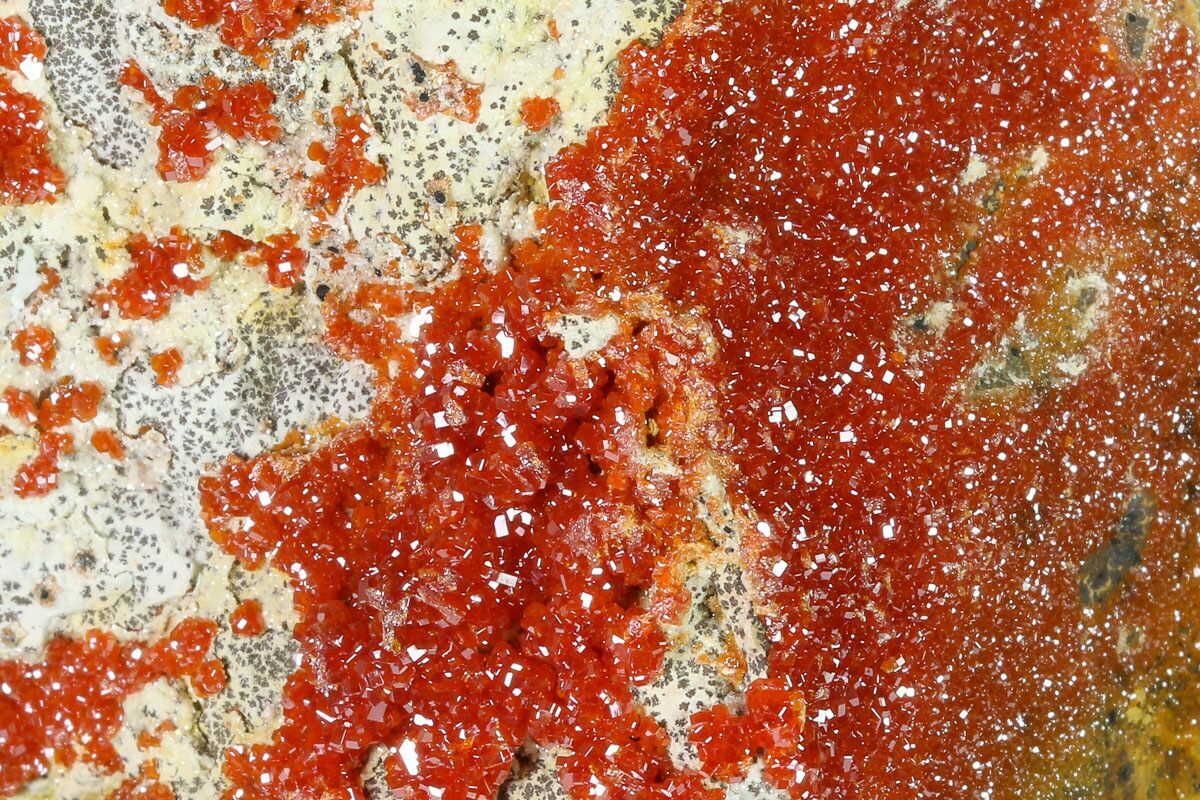 This is a 2.95" wide specimen of small, red and orange vanadinite crystals on dolomite. The small crystals create a lot of sparkle in the specimen