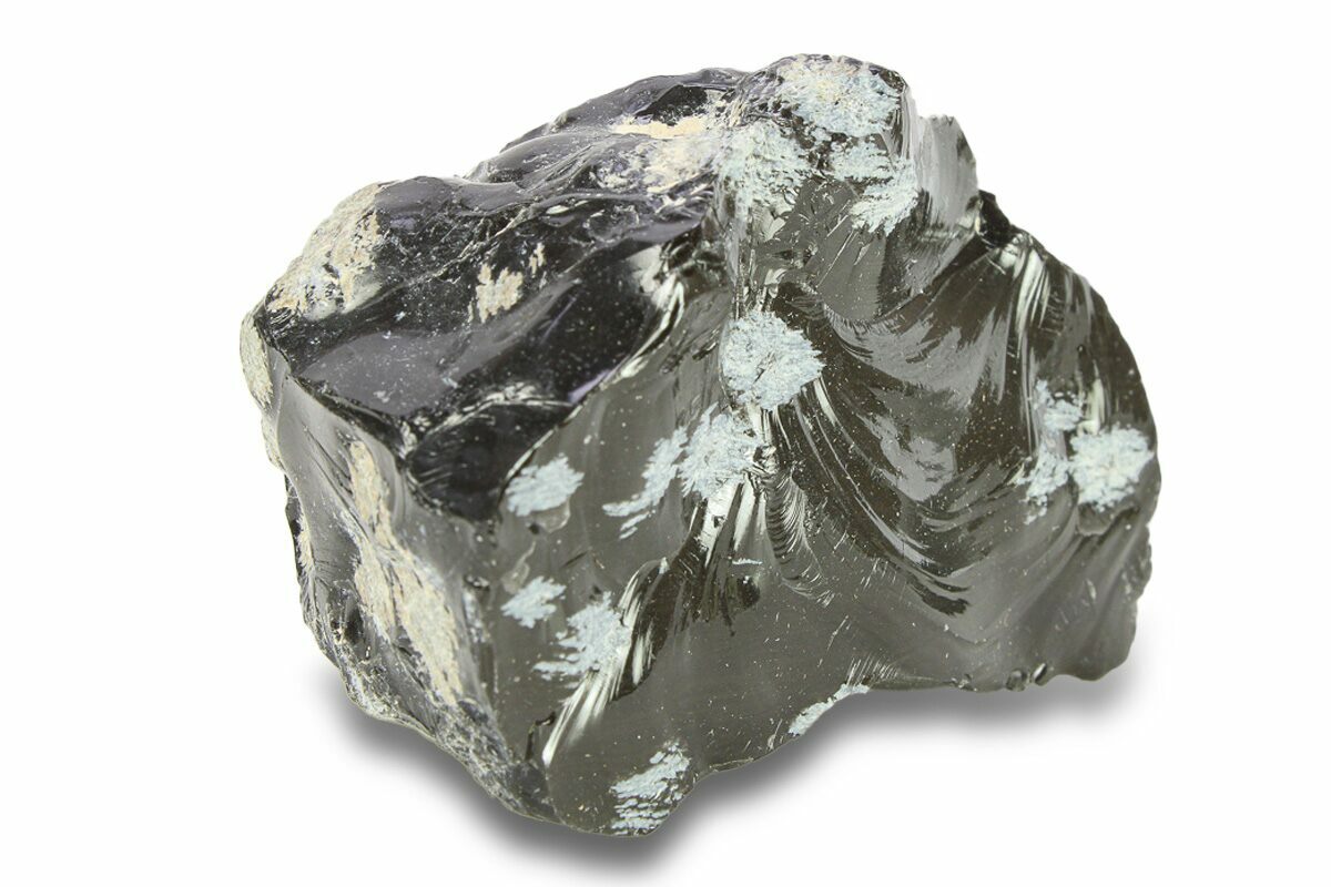 Snowflake obsidian is found near Sevier Lake in Millard County, Utah. It is a natural volcanic "glass" that forms when molten rock cools so quickly that that atoms do not have enough time to arrange themselves into crystals. Instead, the molten material solidifies into an amorphous solid called a glass. The "snowflakes" in the obsidian are small, white, radially clustered crystals of cristobalite, a mineral polymorph of silica.