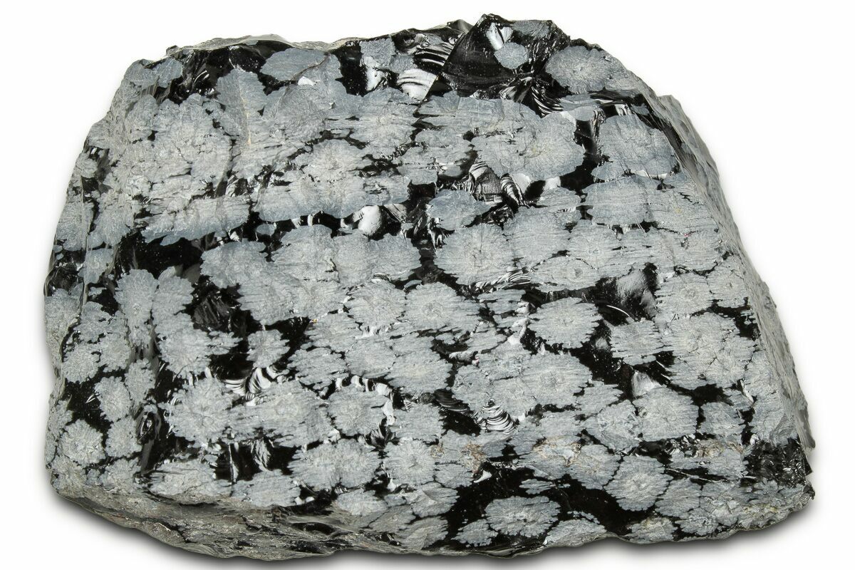 Snowflake obsidian is found near Sevier Lake in Millard County, Utah. It is a natural volcanic "glass" that forms when molten rock cools so quickly that that atoms do not have enough time to arrange themselves into crystals. Instead, the molten material solidifies into an amorphous solid called a glass. The "snowflakes" in the obsidian are small, white, radially clustered crystals of cristobalite, a mineral polymorph of silica.