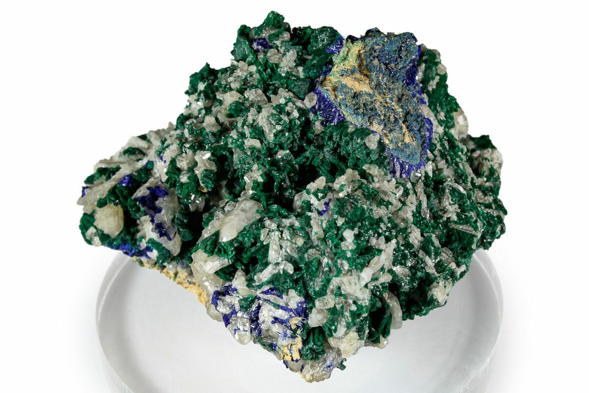 This is a 2" wide mineral specimen from the Yanga Koubenza quarries in the Republic of the Congo (Brazzaville). It features silky green malachite and sparkling, deep blue azurite crystals. White cerussite crystals can be found scattered across the specimen.