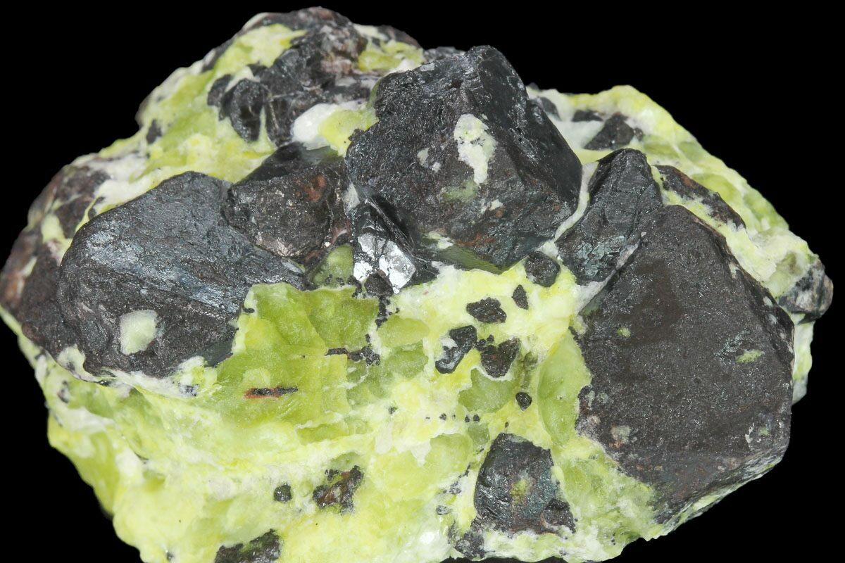 This is a 2" wide specimen that contains hematite crystals (pseudomorph after Ilmenite) that are partially encased by a lizardite (yellow-green) and hydrotalcite (white) matrix. This beautiful specimen was collected from the Øvre Dypingdal Mine (Dypingdal Serpentine-magnesite deposit) of Buskerud, Norway.