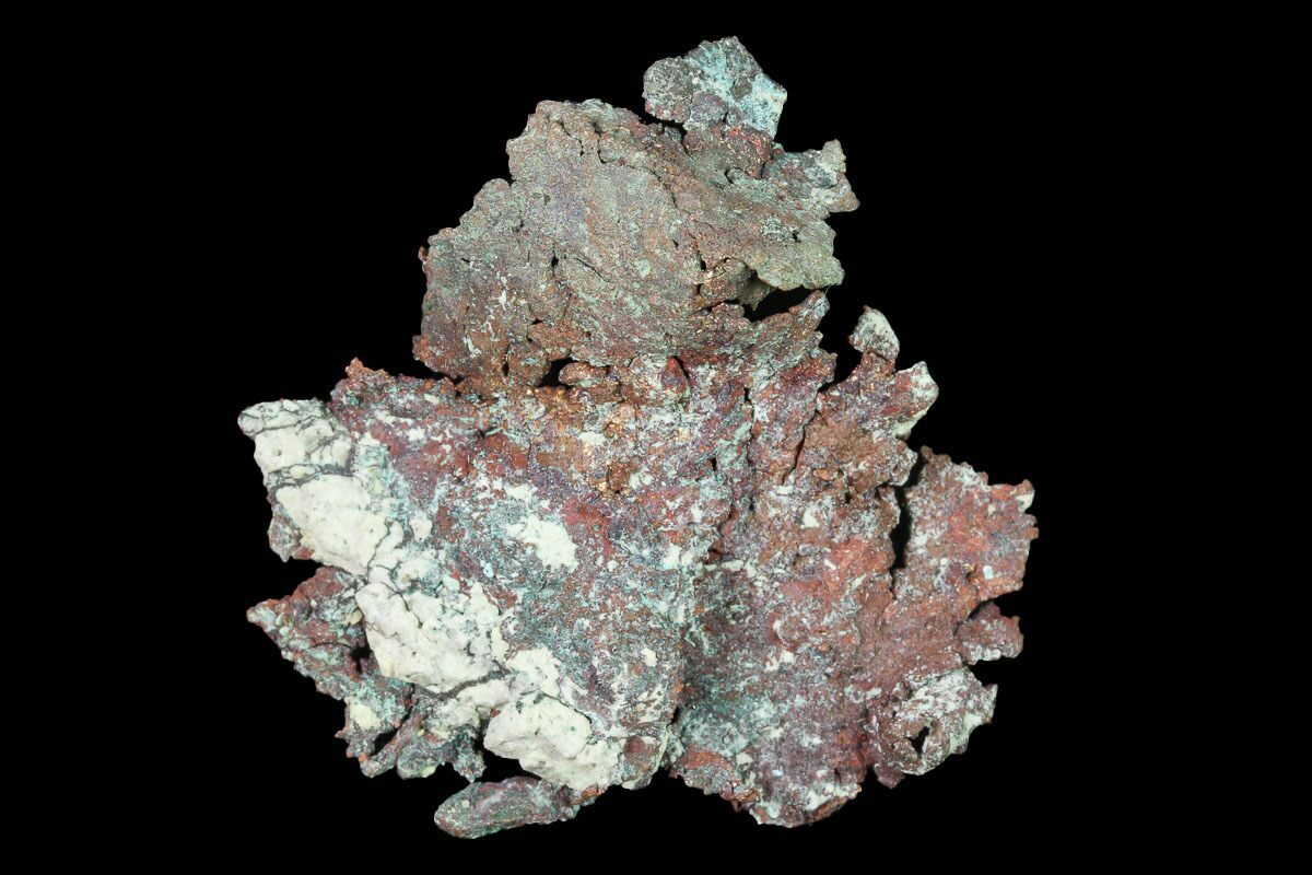 This is a natural formation of native copper with cuprite, mined from the Carissa Pit in the Battle Mountain Mining District of Nevada. It has a green and brown patina and has been prepped free from the matrix it was found in.