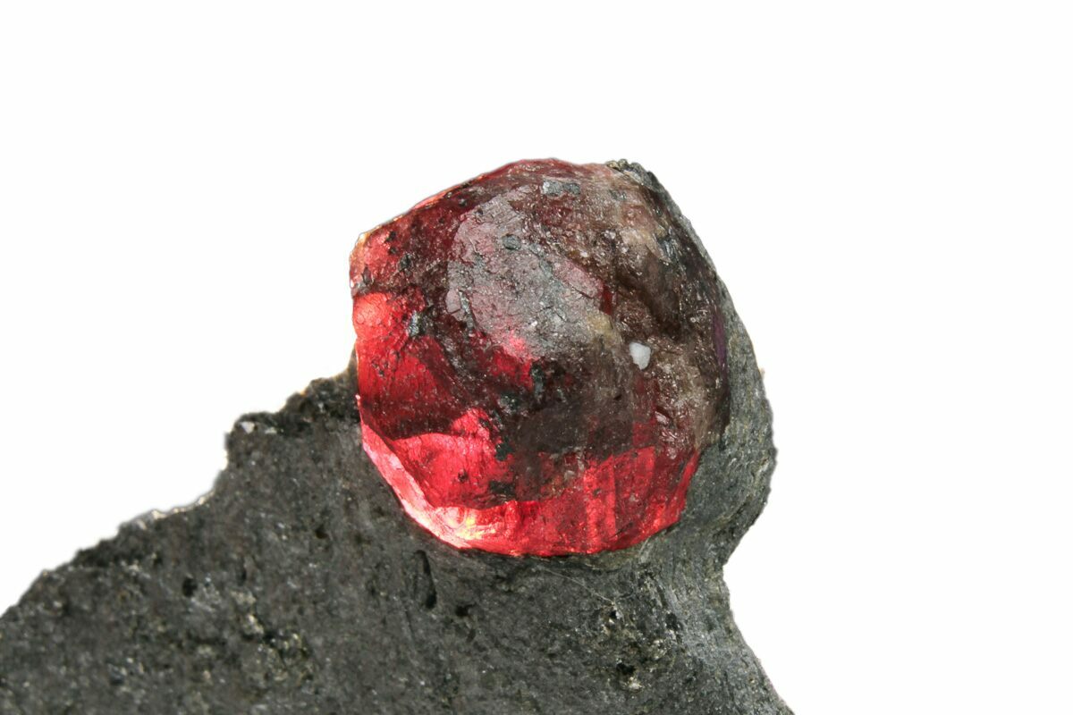 The garnets from this mine exhibit vibrant red coloration, especially when backlit. For this reason, garnet specimens that are left in the graphite matrix are often worked along both sides to allow light to pass through the garnet, primarily with the help of air-abrasives. Some garnets are removed from the matrix to be cut and polished for jewelry application.