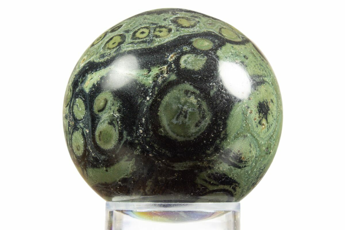 This is a beautiful hand polished sphere made from kambaba jasper found in Madagascar. It is 2" wide and has dark circular mineral formations throughout the green matrix.