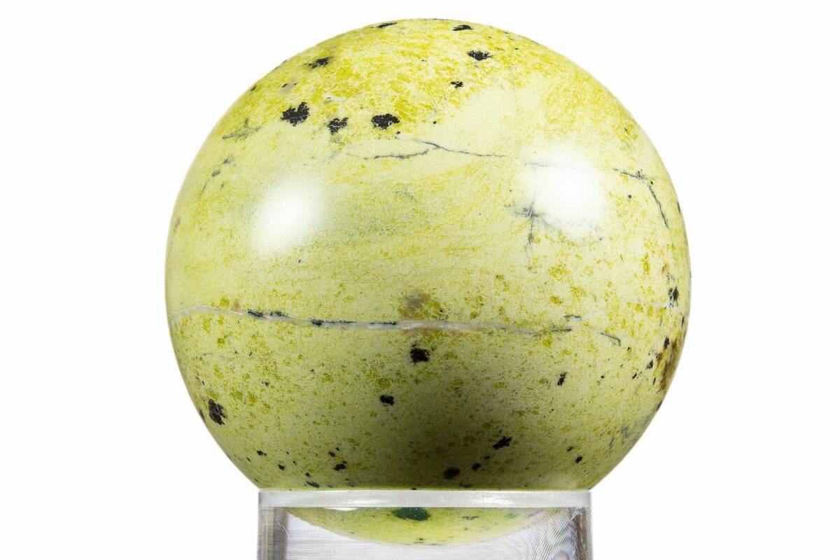 This is a 2" wide polished sphere of lizardite with grey hematite inclusions. It comes with an acrylic ring display stand.