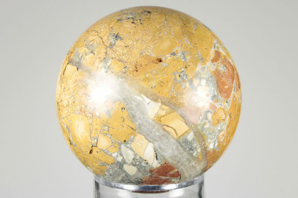 This is a 2" wide, polished sphere of maligano jasper from Sulawesi, Indonesia. It comes with the pictured stand.