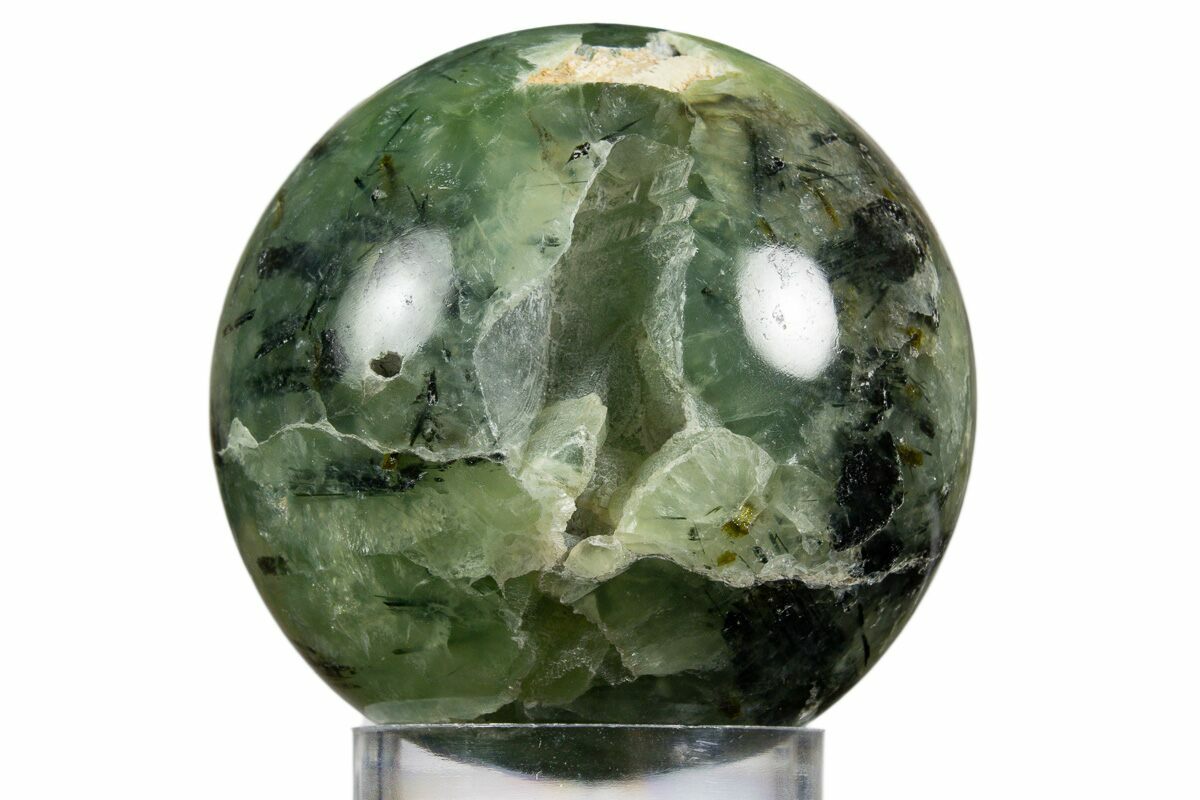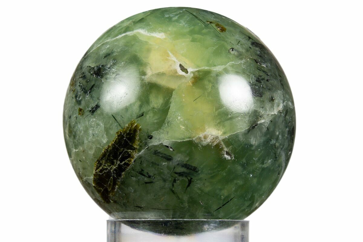 This is a glassy, 2" wide sphere of polished prehnite with dark green epidote inclusions. It comes with an acrylic ring display stand.