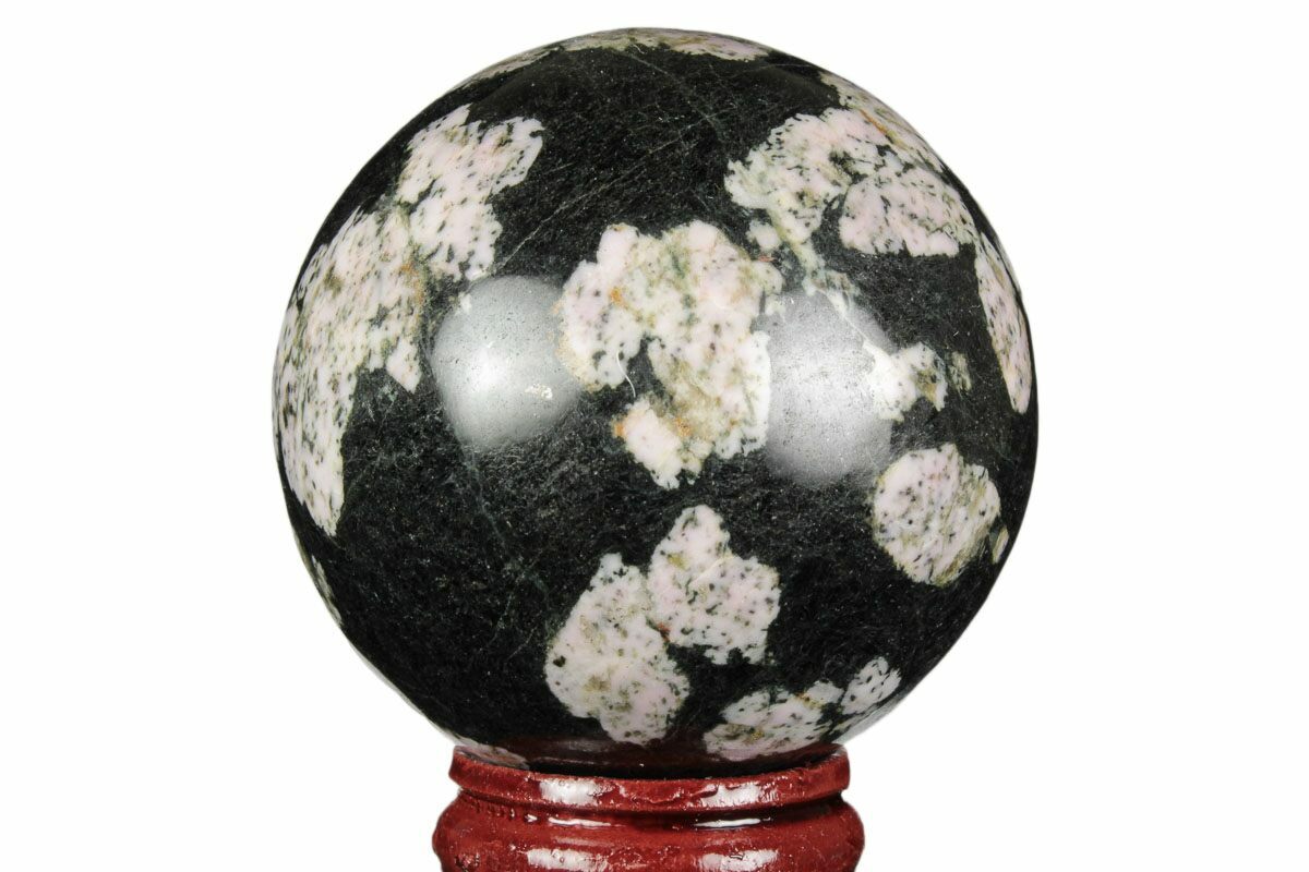This is a 2" wide polished sphere made from a mineral deposit in Pakistan. This specific material can be found on the market labelled as "snowflake obsidian", "snowflake rhodonite", "rhodonite (snowflake)", "dendritic rhodonite", etc.. While this stone is definitely not made from obsidian, rhodonite is a good possibility. However due to this uncertainty, we are just referring to these specimens as snowflake stone.
