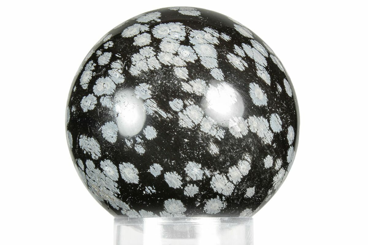 This is a 2" wide, sphere made from snowflake obsidian collected near Sevier Lake in Millard County, Utah. It has been polished to a glossy finish and comes with an acrylic ring display stand.