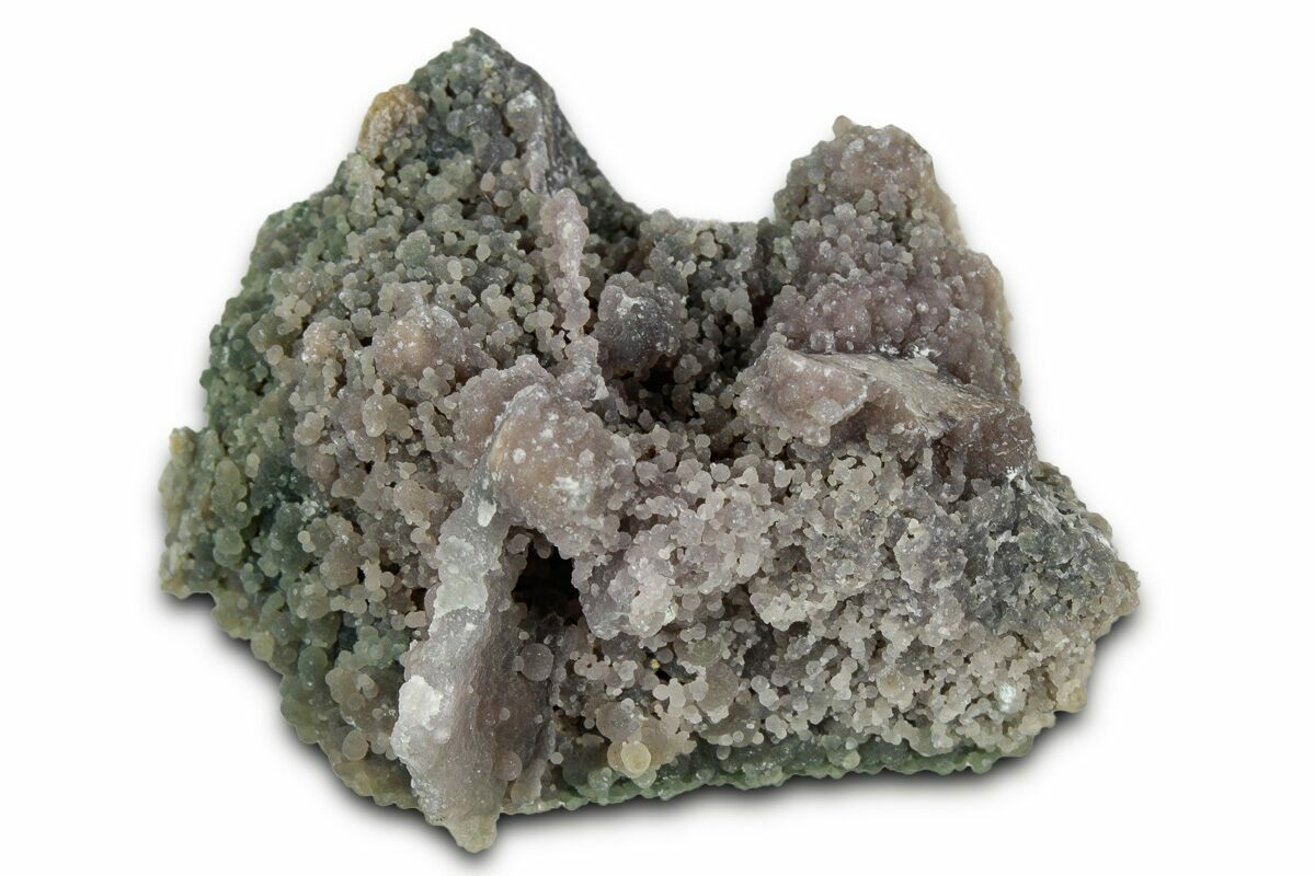 These formations were created over millions of years as silica-rich fluids filled voids and crevices in volcanic rock. As the fluids cooled, they precipitated tiny quartz crystals, which slowly grew in layers to create the nodules we see today. Its mineral composition and appearance set it apart from traditional agates, and it would be most technically correct to call it a "amethystine botryoidal chalcedony". As a collectible mineral, it’s relatively durable but should be kept out of direct sunlight to prevent color fading.