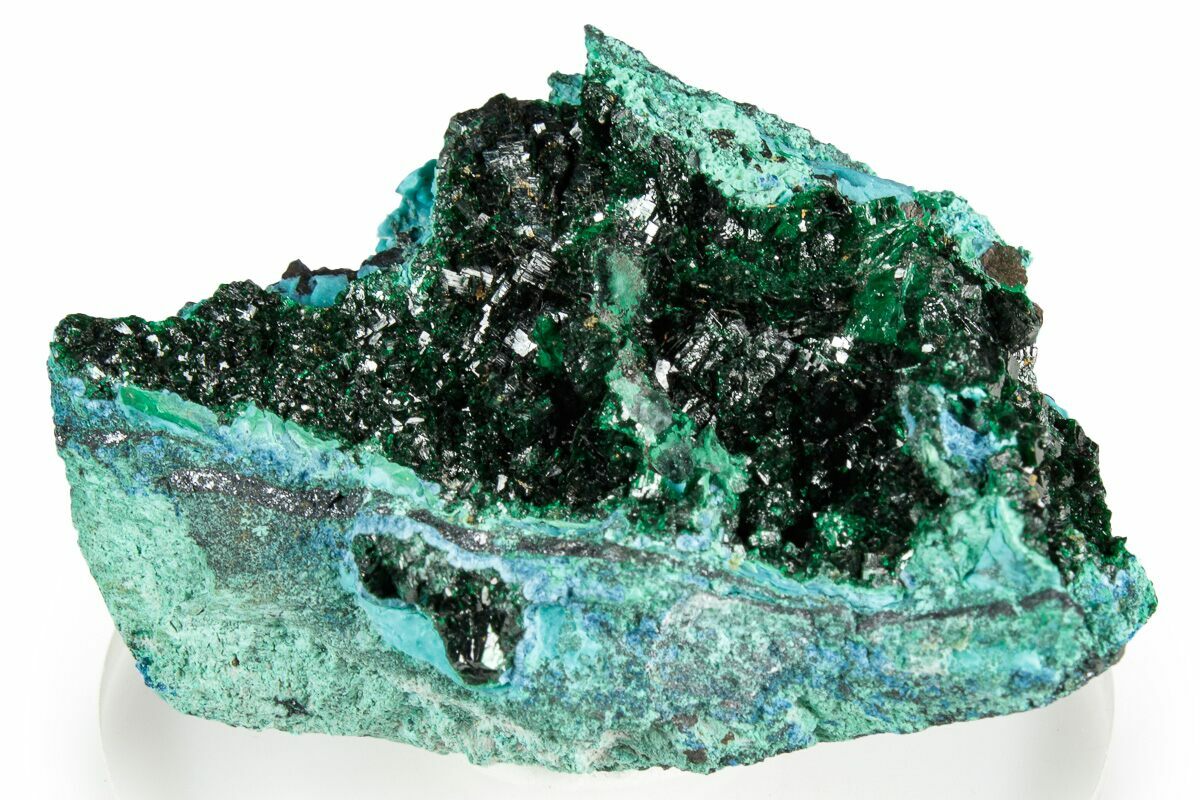 This is a cluster of sparkling green malachite crystals formed over a bed of blue planchite, collected from the Mindouli District in Brazzaville (Republic of Congo). A beautiful and colorful mineral association to say the least.