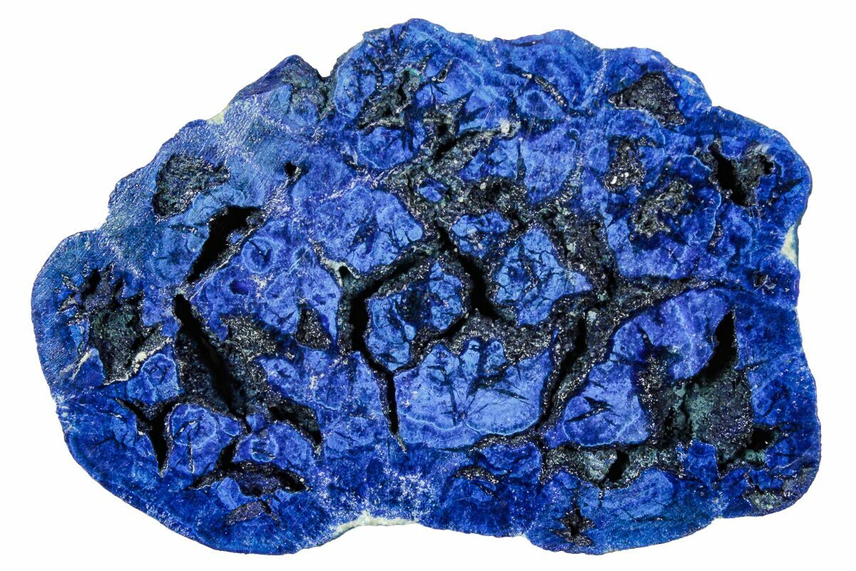 This is an incredibly vivid, blue azurite nodule half that has been cut flat and polished to a glossy finish. Only the pictured half of the nodule is included. These vibrant nodules come from Rubtsovsk mine in Altai Krai, Siberia.