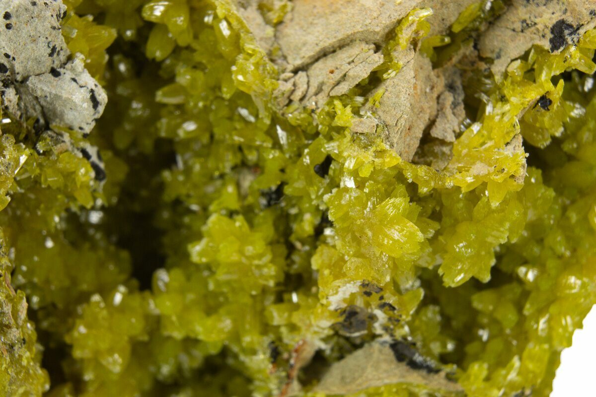 This is a 2" wide formation of yellow-green pyromorphite crystals from the Yanga Koubenza Quarries in the Mfouati District of Brazzaville (Republic of Congo).