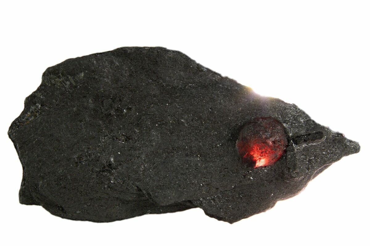 This is a .22" wide almandine garnet in a graphite matrix from the Red Embers Mine near Erving, Massachusetts. The graphite matrix has been worked to expose most of the garnet from each side. There are dravite crystals peppered throughout the graphite matrix.
