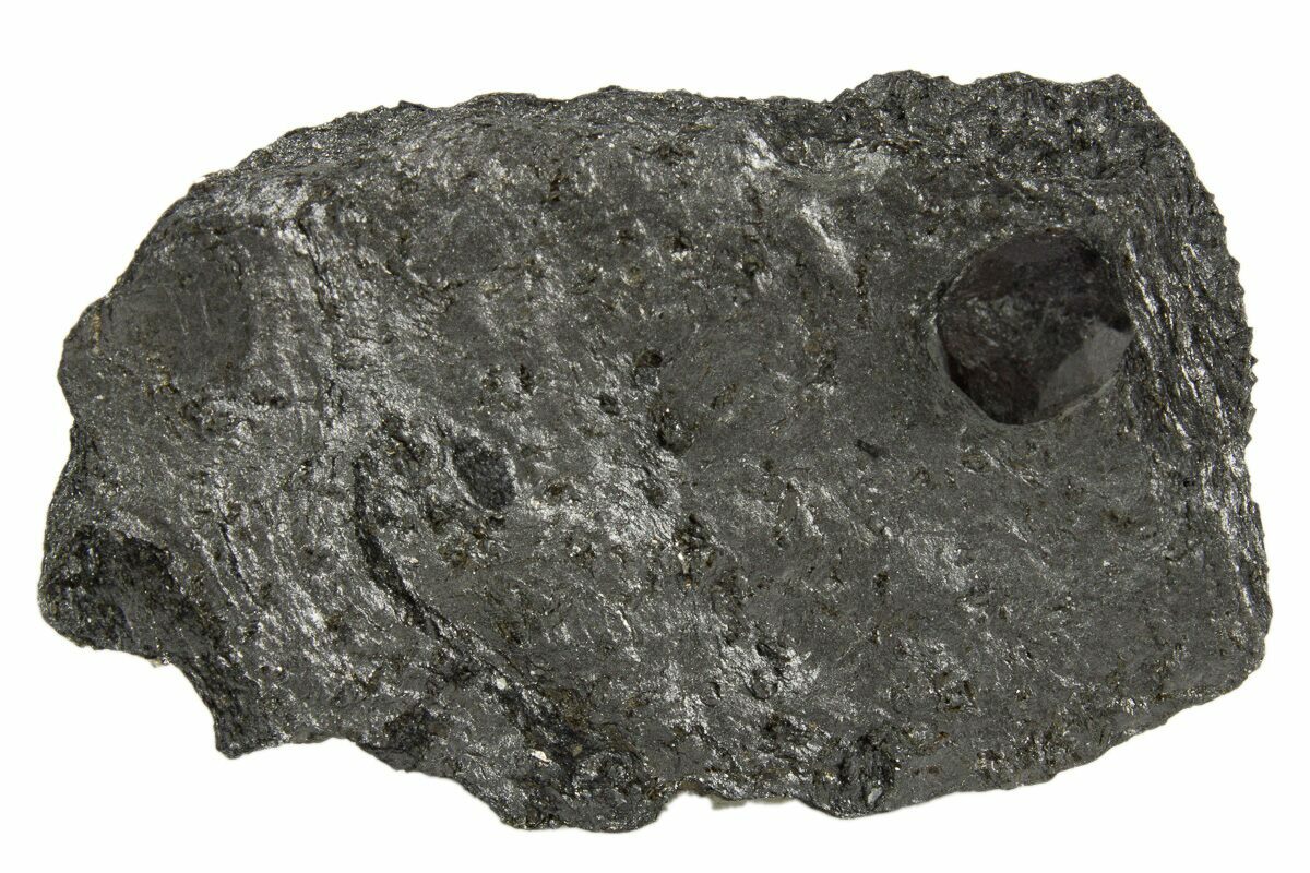 This is a .28" wide almandine garnet in a graphite matrix from the Red Embers Mine near Erving, Massachusetts. The graphite matrix has been worked to expose most of the garnet from each side. There are dravite crystals peppered throughout the graphite matrix.