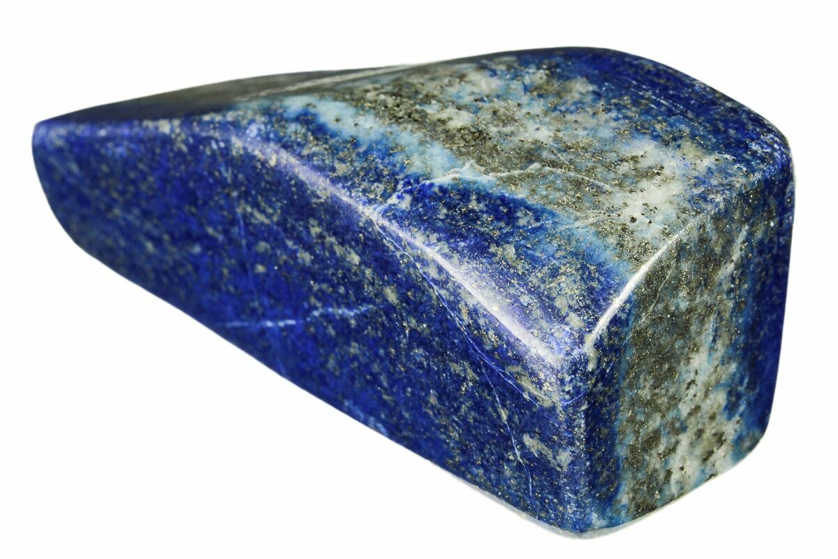 This is a 3.0" wide, polished piece of lapis lazuli with streaks of sparkling pyrite running through it. This vibrant blue stone was mined from Northern Pakistan.