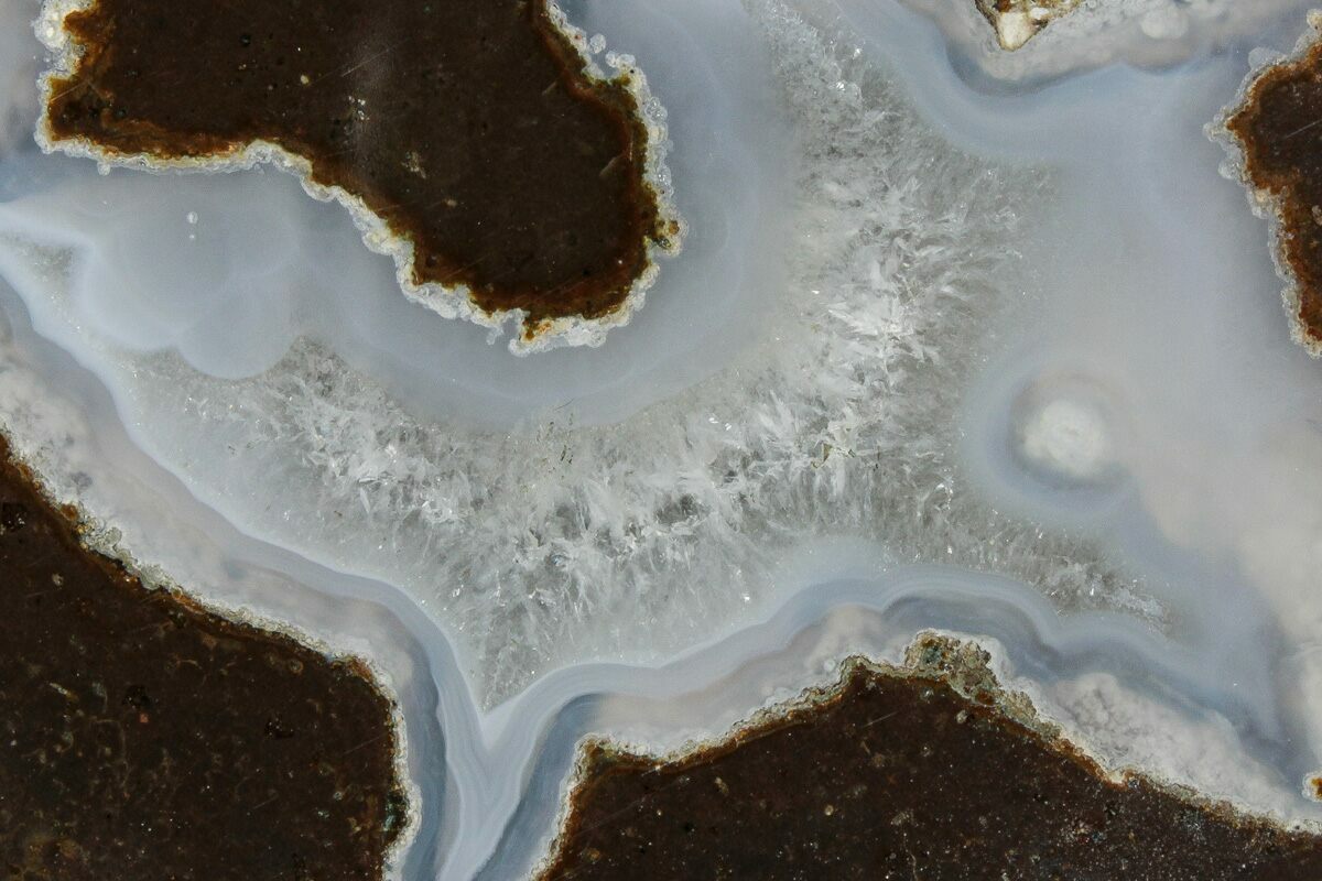 This is a gorgeous thunderegg half, collected from 79 Bed near McDermitt, Nevada. This unique specimen features a core which is filled with white to light blue chalcedony.