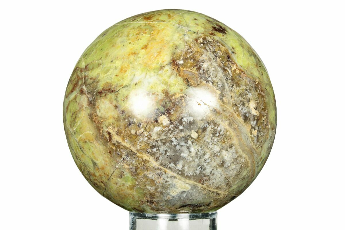This is a 3.05" wide, polished green opal sphere. The unique stone has a rich, pistachio green color and interesting patterning. It comes with an acrylic ring display stand.