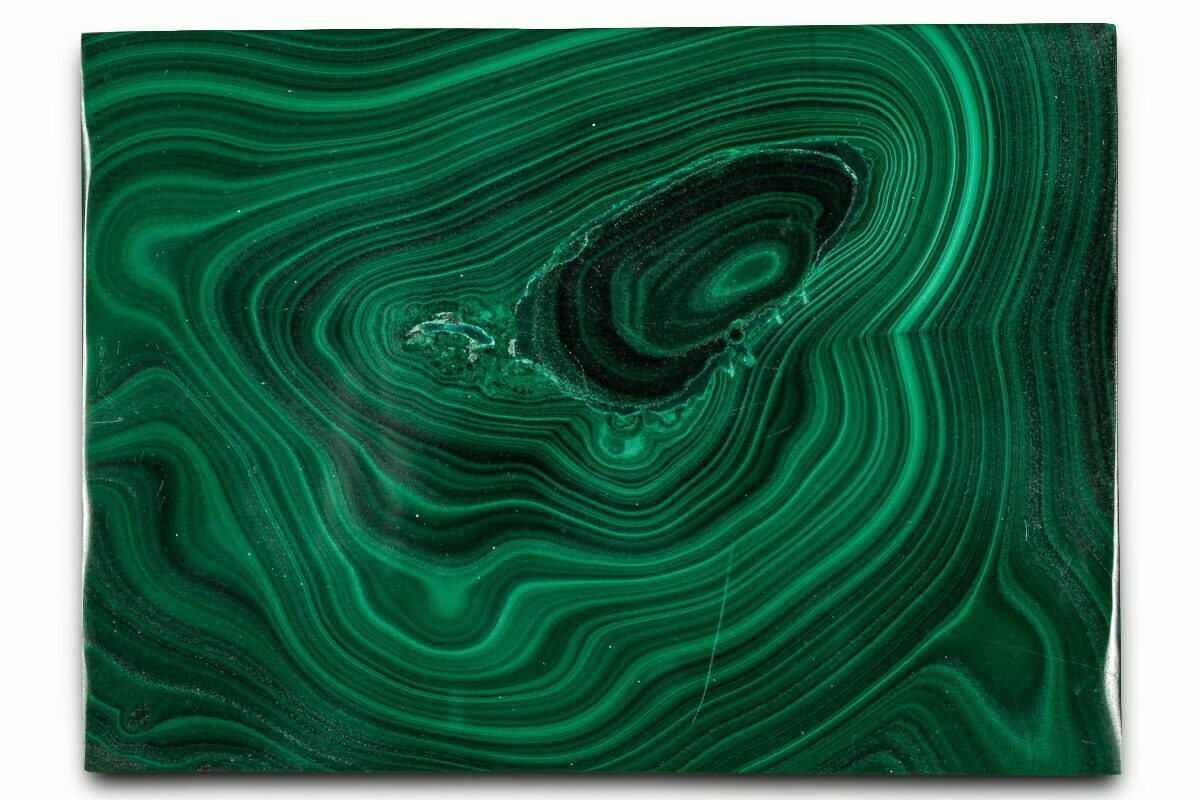 Malachite is an intense green copper-based mineral that can be found in a wide variety of forms. Malachite can grow in botryoidal masses, stalactitic formations, and reniform formations, typically as a tight cluster of fanning fibrous needles that make up a seemingly solid mass. As layers continue to stack during formation, banded patterns can sometimes begin to take shape, explaining the rings in all shades of green seen on most polished malachite specimens.