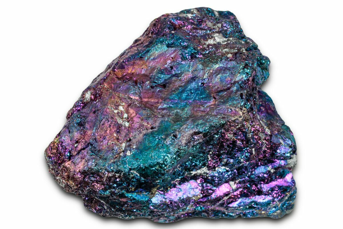 Often called “Peacock Ore” for its vivid, iridescent colors, this material is actually chalcopyrite that has been treated with acid. The treatment replicates a natural process that forms the much rarer copper mineral bornite.