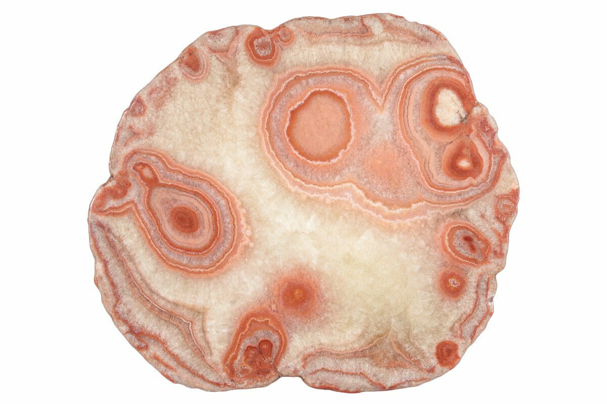 Potato agate, also known as Dulcote agate, is a unique and unusual kind of agate from the Dulcote quarry in the county of Somerset in England. Agate is very rare in England, so these unusual beauties are often sought after for both their rarity and striking colors. The potato part of their name comes from their quite lumpy and potato-like exteriors, unlike their gorgeous interiors. These agates often display an array of red, white, orange, and pink banding, along with occasional quartz pockets.