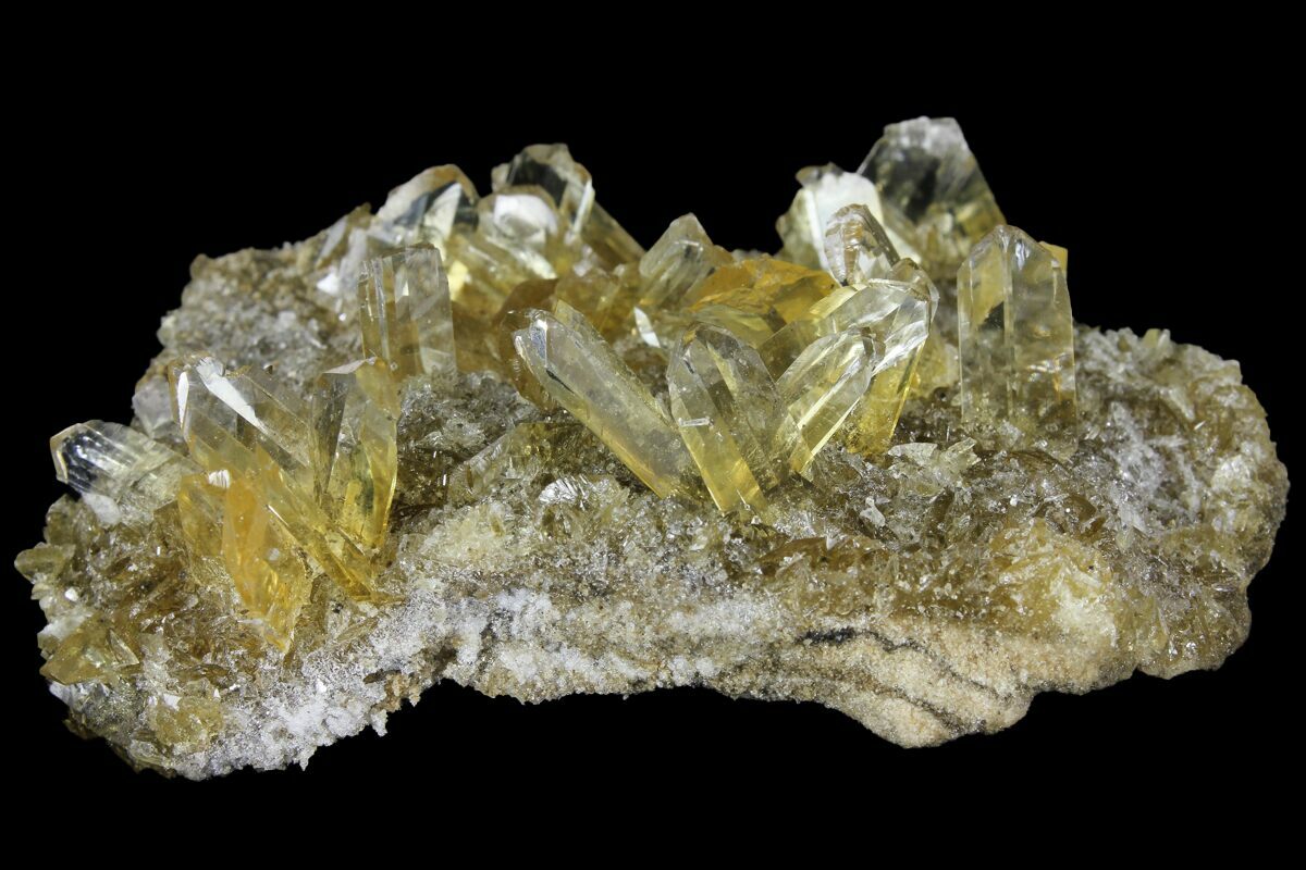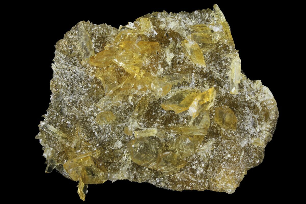 This is a beautiful yellow selenite crystal aggregation that was collected from Peru. The crystals are highly fluorescent under short wave UV and emit phosphorescent light that remains several seconds after the UV light is turned off.