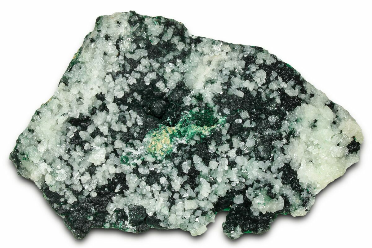 This beautiful specimen contains sparkling white cerussite crystals that formed over botryoidal malachite. This mineral association was collected from the M'fouati District of the Republic of Congo.