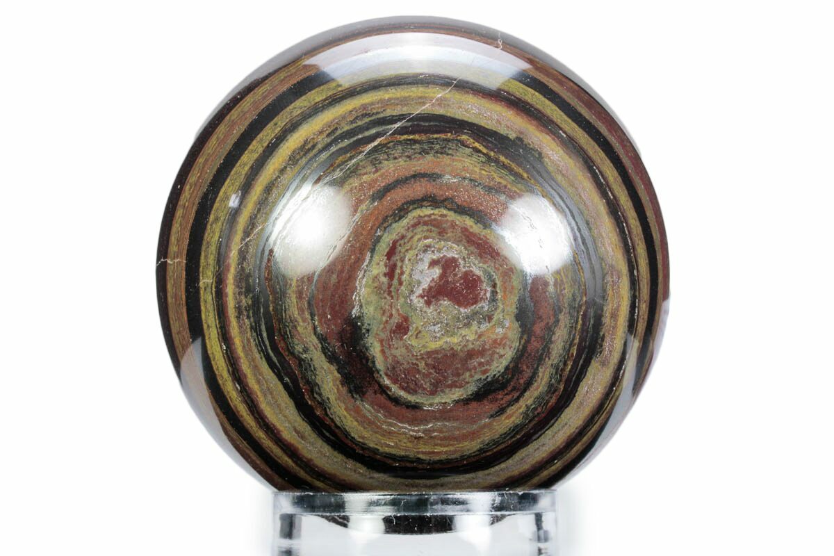This is a gorgeous and incredibly colorful, 3.15" wide polished sphere crafted from a chunk of a banded iron formation collected in the Pilbara Region of Western Australia. The polish is flawless and it displays beautifully on the accompanied acrylic ring display stand.